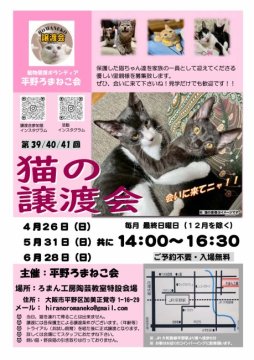 大阪市平野区を拠点に野良猫問題、TNR活動、子猫保護、譲渡会、里親譲渡、迷子猫捜索等の活動をしております。