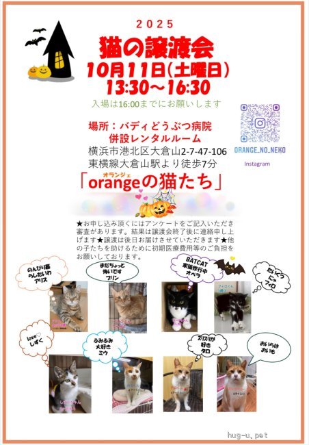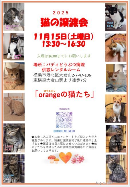 私たち『orangeの猫たち』は横浜市を中心に猫のTNRで子猫や負傷してる猫、家猫になれそうな猫は可能な限り保護をしたいと思っている個人活動者の集まりです。新しい飼い主に繋ぐことで次の保護ができます。大倉山にて譲渡会を毎月開催してます。7月〜9月は月に2回開催してます。
