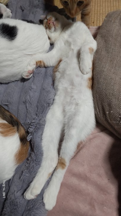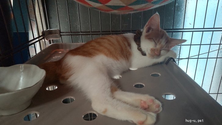 とにかくそういう経緯で保護され、島の動物病院に預けられました。その後飼い猫の通院のため動物病院へ行った際、「おっ可愛い子おるやん。保護猫?うちに来る?」という感じで、はたおり家の預かり猫となりました。わが家では11匹目の預かり猫です。