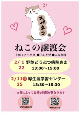 名古屋市天白区の野並どうぶつ病院さまで11月9日猫の譲渡会を開催します。子猫もたくさん、大人猫も若い猫さんが多いです。お外の過酷な環境にいた猫ちゃんたちを丁寧にお世話し、家猫トレーニングを済ませています。初めて猫をお迎えしたい方でも保護主がしっかりとサポートしますので、ご心配はありません。まずはぜひ猫ちゃんたちに会いに来てください。