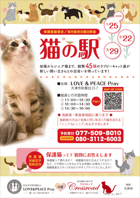 総勢40頭以上の猫たちが、新しい飼い主さんとの出会いを待っています。 完全予約制になりますが、ゆっくり猫たちと対面していただくことができます。 ぜひ、お越しください❣️ 💖予約受付💖 077-509-8010 080-3112-6003 特定非営利活動法人LOVE&PEACE Pray