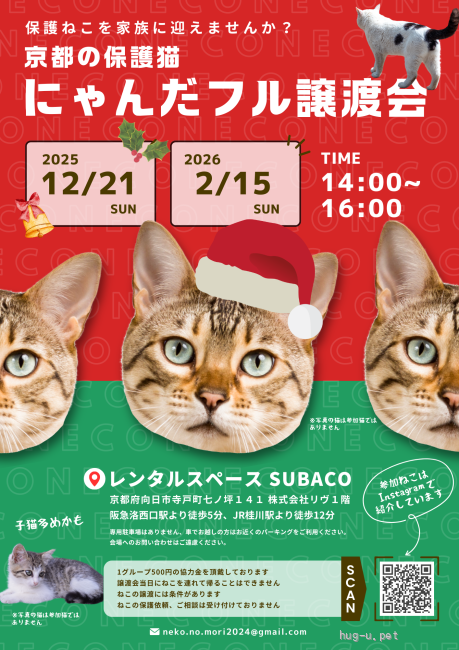猫がいる生活の楽しさを広め、人にとっても、猫にとっても毎日の暮らしが幸せであるように、適正飼養の普及啓発を行います。 保護猫のためのずっとのおうち探し「ねこの譲渡会」を定期的に開催します。 また譲渡会場では、猫の飼育相談もお受けします。 *参加猫の情報等、詳しくはブログをご覧ください。 *現在、保護猫を連れて譲渡会に参加出来るのは、正会員からの推薦がある方のみです。 *運営の寄附として1グループ¥500のご協力をお願いします。