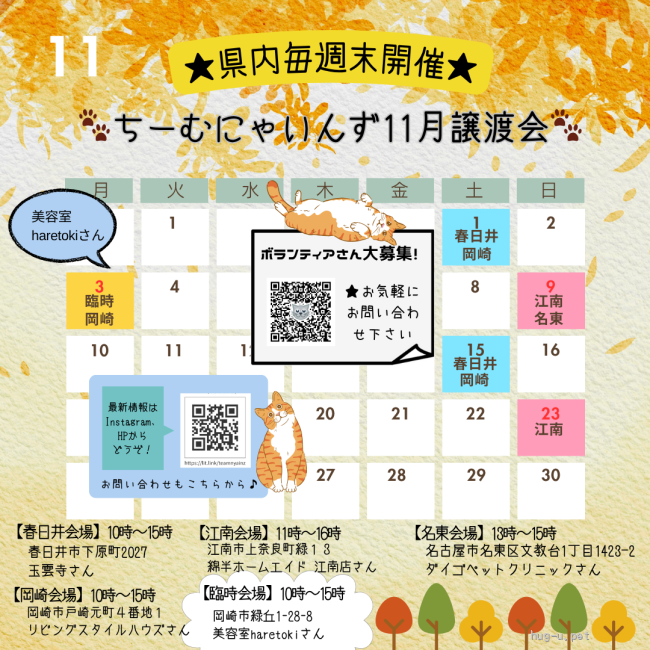 【in岡崎市☆子猫もいっぱい☆保護猫達を暖かいオウチに迎えよう☆2025年11月15日(土)~ 非営利団体「ちーむ にゃいんず」】