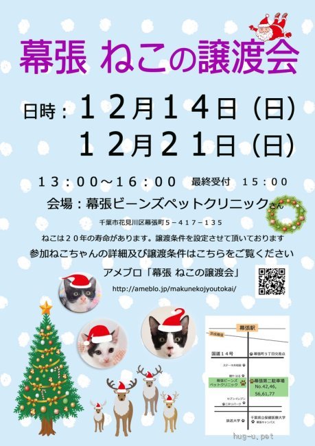 12月14日(日)幕張ねこの譲渡会 会場: 幕張ビーンズペットクリニック (千葉市花見川区幕張町5-417-135) 時間: 13:00-16:00(最終受付15:00) 予約制ではないのでお好きな時間にお越しください。 会場駐車場は5台、近隣に有料駐車場あります。 JR幕張駅、京成幕張駅からは徒歩で10分位です。