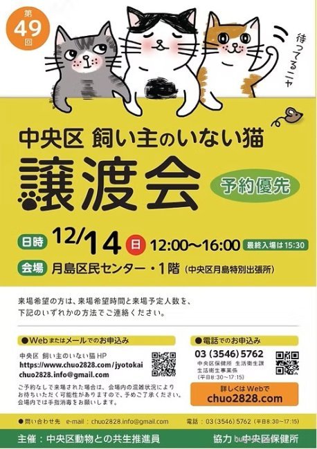 【12/14(日)12:00-16:00】月島で行われる中央区飼い主のいない猫譲渡会に参加予定です。