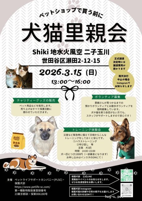 世田谷区のカフェでの中型MIX犬の里親会です。 様々なバックグラウンドを持つ保護犬たちが参加します。 これから保護犬を迎えようと考えている方も 保護犬に興味があるけど、まだ迎えるまでは考えられていない方も、ぜひお越しください。 当日はチャリティグッズ販売やトレーニング体験会も開催されます。