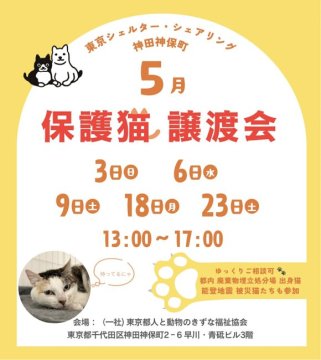 東京シェルター・シェアリング神田神保町シェルターにて過ごしている猫たちを対象としたオープンシェルター保護猫譲渡会です。時間内でしたら、ご予約なくお越しいただけます。