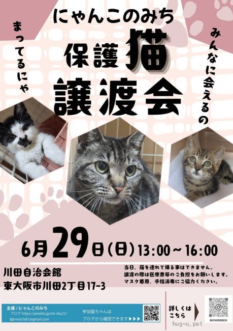 『にゃんこのみち』のネコたちは、ほとんどが捨てられたり、外でつらい生活を送っていました。そんなネコたちに優しい里親さまを見つけたいと、保護猫の里親譲渡会を開催しております。可愛い家族をお探しの皆さま、ネコに興味のある皆さまのご来場、心よりお待ちしております! 参加ネコ等は『にゃんこのみち』ブログでご紹介しています。 よろしくお願いいたします。 駐車場有 会場でお尋ねください。