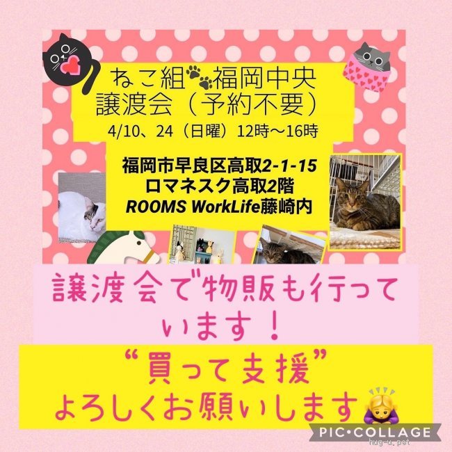 福岡市内で猫の保護やTNR(猫を捕獲→避妊去勢手術→リターン)という活動を行なっています。なるだけ多くの子をお家の中に入れてあげたくて毎週日曜は譲渡会を開催しています。