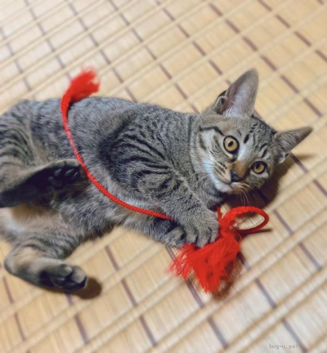 性格や特徴 ぽっちゃり型のキジトラ、綺麗な長しっぽの仔猫です。