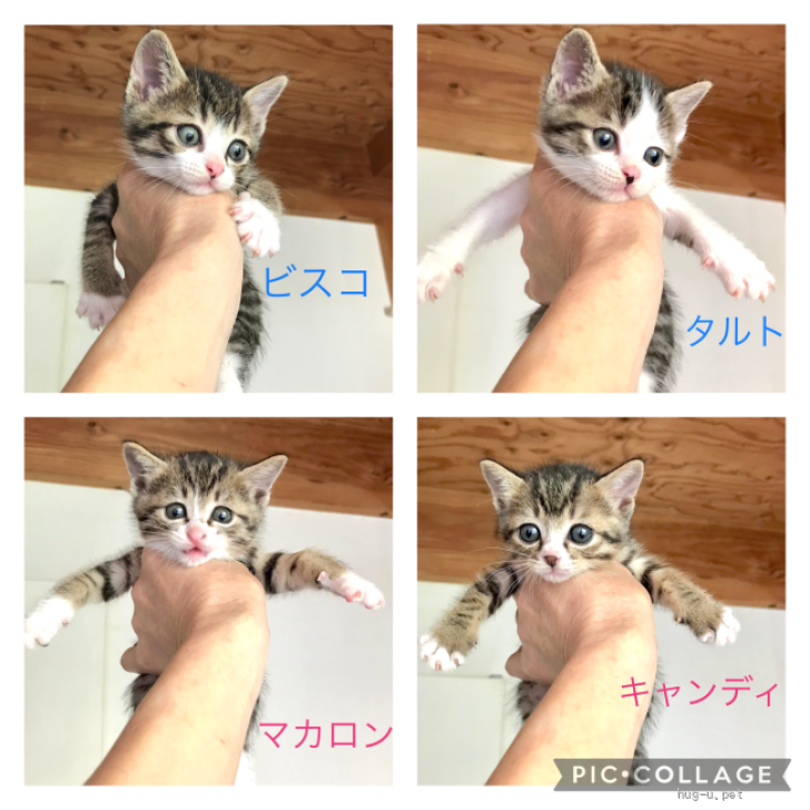 | 性格や特徴 | 推定2023/4/初旬生の4兄妹です。 保護当時200-300g台で涙目でしたが今はしっかり食べて飲んで急成長しています。 楽しいこと大好き、元気いっぱい走り回って、ご飯!遊んで!と大きな声で要望してきます。 ◎キャンディ(キジ柄多め)メス 当初の体重は270g。目立って小さな女の子でした。みんなに負けないようにフードは毎食一心不乱に食べてお腹を満たそうとしますが、小分けに与えると落ち着いて食べられます。尻尾はすらり長くて真っ直ぐ、お鼻は黒。6/1現在、720g。 ◎マカロン (ピンクのお鼻)メス ふんわり系な女の子。離乳がスローでカリカリを食べる速度も他の3匹にはついていけません。お腹を満たせていないこともあり、こっそり別に足してあげることもあります。尻尾は中長、お鼻はピンク。730g。 ◎タルト(ずれた前髪風の柄)オス 一番大柄、ほっこり系男の子。食べるペースはピカイチ。ちょっとした刺激にさえもビクッとして飛び上がるなど敏感な一面もあります。尻尾はカクカク、全体的に白毛多め、ちょっとズレた前髪が特徴。870g。 ◎ビスコ(タキシード柄)オス かっこいい系、元気いっぱい食欲旺盛な男の子。お目々くりくり、タキシード柄が一番分かりやすいのが特徴。尻尾は長め先端曲がり。840g。 ※体重は6/1現在 ※2匹ずつオスメスペアでの譲渡となります。 ※体調の急変やこのあとの成長によってワクチンが間に合わない場合には譲渡会には参加せずに会場でご相談を承ります。 ☆ペアでの譲渡です 1匹での譲渡は考えておりません 【こんなご家庭を探しています】 ・お留守番が短い ・誤食がないよう整理整頓されたお部屋 ・脱走や転落、熱中症などの事故防止、体調管理に細心の注意を払える(時間的、経済的、精神的な余裕がある) ・カーテンやソファなどボロボロにされたりゴミ漁りなどのいたずらにもおおらかでいられる ・猫のためのスペースが広い ・猫の飼育経験がある、ない場合も猫カフェなどでたくさん触れ合って、アレルギー検査なども済んでいる ・これから20年、家族やお住まいなどの大きな変化の予定がない |