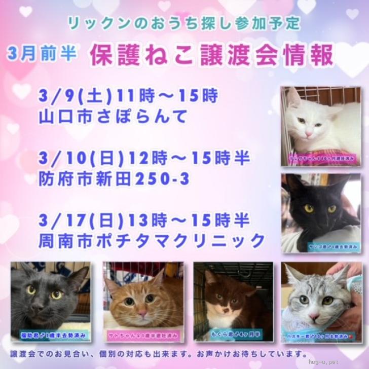 3/9山口市さぽらんて、3/10防府市新田250-3での譲渡会に参加予定ですが、個別のお見合いにも対応します。