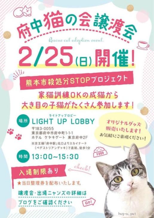 | その他備考 | ☆:*:★:*:☆:*:★:*:☆:*:★:*:☆:*:★:*:☆: 府中駅から直結 家猫訓練OKの成猫から 大きめの子猫がたくさん参加! 譲渡会開催‼️ ☆:*:★:*:☆:*:★:*:☆:*:★:*:☆:*:★:*:☆:* 【日時】2月25日(日)13時〜15時30分まで 【場所】LIGHT UP LOBBY (下記のリンクに詳細あり)https://youtu.be/jxn2O6sdyO ※ご予約の必要はございません。混雑の場合は事前に整理券を配布させていただきます。 😺猫ちゃんを家族に迎えたいな… でも、保護猫ってハードルが高そうな気がするわ? その点はご安心ください。出場する全ての猫達はみんな家猫訓練を受けており、トイレ訓練もパーフェクトな子達が譲渡会に参加します。 猫飼い初心者OKな猫ちゃん達沢山います。 😺でも?仕事もあるし、お留守番が心配だわ… その心配はご無用です! 今回出場する子達はみんなお留守番OKな子達ばかりなのでお仕事をフルタイムでお持ちのご家庭など問題なく迎えていただけます。 (大きめの人馴れ抜群の子猫達からどっしりと落ち着いた成猫までご紹介させていただきます) 😺我が子の為にも保護猫を迎えたい。しかし親側は猫飼い経験あっても子供には初めての猫です。どうしたらいいですか? そのようなご家庭こそぜひ!お越しください! お子様が保護猫達と一緒に育つ事により、命に優しい情操教育となると願うからです。 ※お子様の健康を守る為にも猫に接触した事のないお子様達のアレルギー検査をお願いしております。 😺60歳以上の里親希望者様 今時の60代様、70代様は、大変お若くアグレッシブでいらっしゃいます! そんな方々にはぜひ!成猫さんをオススメさせていただきます。 今回出場する成猫さんは、捨てられた子達ばかりです。(多頭崩壊、飼育放棄、夜逃げによる強制執行) みんな心に傷を負っている子達を保護しております。しばらく心のケアや家猫訓練をバスした子達を出場させますので、ぜひ!会いに来てください。 ※60歳以上の方は後継人をお願いしております。後継人の方と譲渡会にご来場くださると私達も選考しやすいです。 今回ご披露する猫ちゃん達は、くまっ子空輸にゃんずの他、飼い主から飼育放棄されてしまった捨て猫や強制執行で夜逃げされた猫達など、どの子達もみんな行き場のない子達ばかりを保護し、育て上げた子達が参加します。 自信を持って、この度もかわいい子ども達をご紹介させていただきます! 活動内容や保護猫達の様子が気になる方は、ぜひ!YouTubeちゅー猫チャンネルをご視聴ください。 😸ちゅー猫チャンネル😸 https://youtube.com/@chuneko 【ご見学や応援者の方々へ】 ご来場大変ありだくお待ちしております。 ただし、里親希望の方々を優先してご案内させていただく事をご了承の上お越しいただければ幸いです。 お飲み物をご注文くだされば、ホテルのカフェテラスにご案内させていただきますので、入り口スタッフまでお申し出をよろしくお願いします。 |