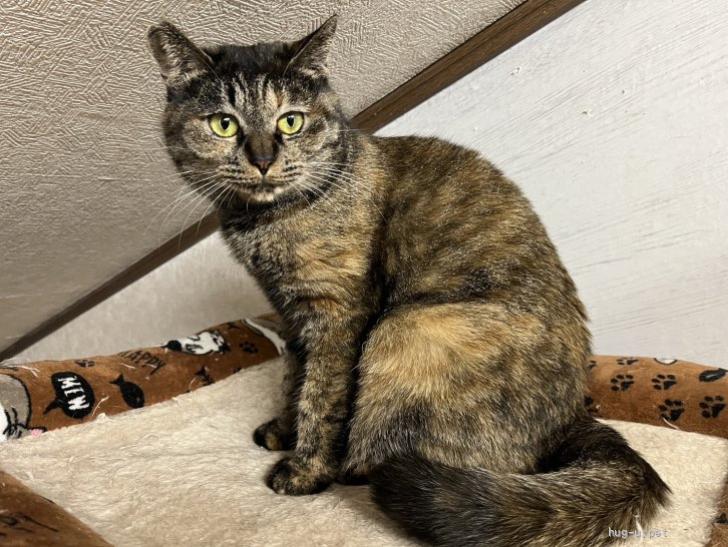 ○年齢不明(2025年1月時点で2歳以上)のムギワラ柄の女の子です。保護時の体重は2.3kgと小柄でスマートです。