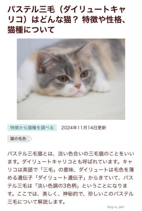 | 性格や特徴 | 穏やかで人馴れしているパステル三毛(ダイリュートキャリコ)♀5ヶ月。ミケ とパステルミケの違いは 黒い毛か、グレーの毛です。 この子は 珍しいグレーの毛です。 大人猫ともみんなと仲良く暮らしています。 ケージあったほう最初は良いです。 子育ての時期を楽しんでください。 1泊二日以上のお留守の時はうちで預かります。 |