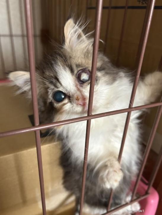 | 健康状態 | 猫風邪の影響なのか分からないですが、保護時にはもう左目が飛び出そうになっていてぐちゃぐちゃだったため、保護時に比べると状態はとても良くなりました 右目も少しだけ曇っていますが、全然見えています もちろんもう左目は見えていないですが、片目でも特に問題なく生活出来ています また、皮膚糸状菌症の治療中で、あと1ヶ月半程で完治する見込みです 健康面は上記以外は特に問題ありません |