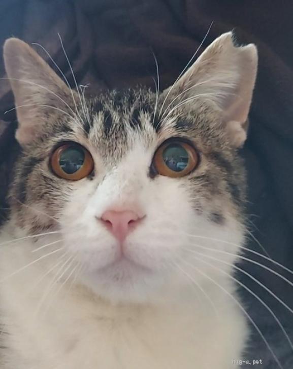 前髪を横に流したような眉間のキジ模様、アイラインをくっきり描いたようなつぶらな飴色のうるうるおめめ、桜色の口もととお鼻の美人さんです。