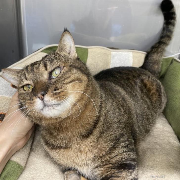 重度の風邪により衰弱していたところを保護・収容されました。収容時から重度の結膜炎により目の周りが赤くただれて痛々しい顔をしていましたが、治療により順調に回復し、見違えるほどきれいになりました。現在も後遺症により左目は少し見えにくい状態ですが、日常生活に大きな問題はありません。