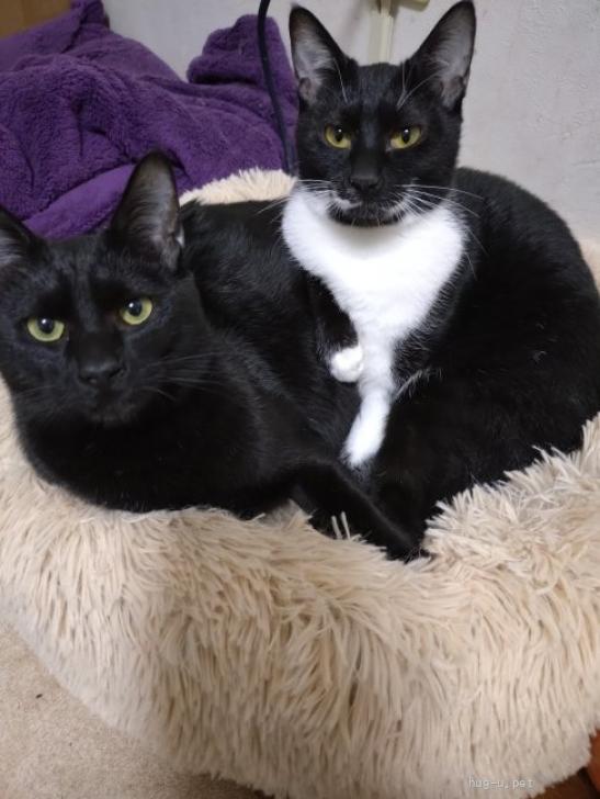 お腹の毛が少し白毛があります。見た目は真っ黒です。甘えん坊さんです。人見知りがあります。