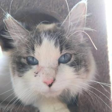 ○年齢不明(2025年4月時点で推定5〜6歳?)のグレー白ハチワレ柄の長毛の男の子です。体重は3.9kg(2025年4月6日時点)です。
