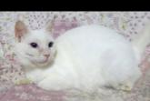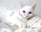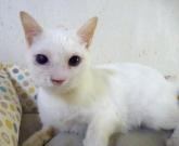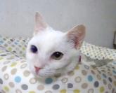 毛色: 白猫、尻尾長い、風邪の治療がされずにいたため、角膜に穴が開き、虹彩と角膜が癒着しているため、片目は見えないようです