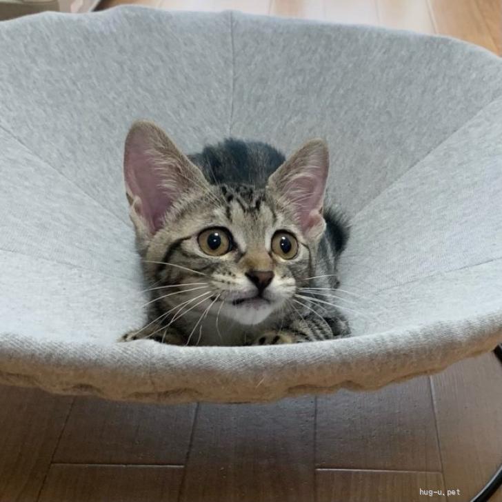 性格や特徴 人間がミルクから育てたので人馴れは抜群!お顔だけ見るとキジトラですが胴体がアメショ柄の、少したれ目の大きな瞳のとても小顔な美猫さん。いつも誰かにちょっかいをかけて遊び相手を探しています(笑)人間にもごろごろ甘えん坊。すぐにお膝に乗ってきて、抱っこすると脱力してうっとりです。とにかくすぐにお膝にやって来て、遊び疲れるとお膝で寝てしまいます。ご飯もモリモリとよく食べます。とても柔らかい被毛で撫で心地は最高!運動神経もよく身軽で猫タワーにも華麗にジャンプしています。