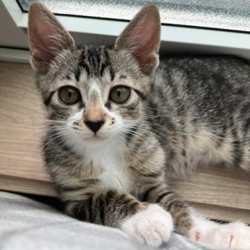 ○生後2ヶ月半くらい(2025年7月中旬時点)のキジ白でたれ目の女の子です。体重は1.15kg(2025年7月17日時点)です。