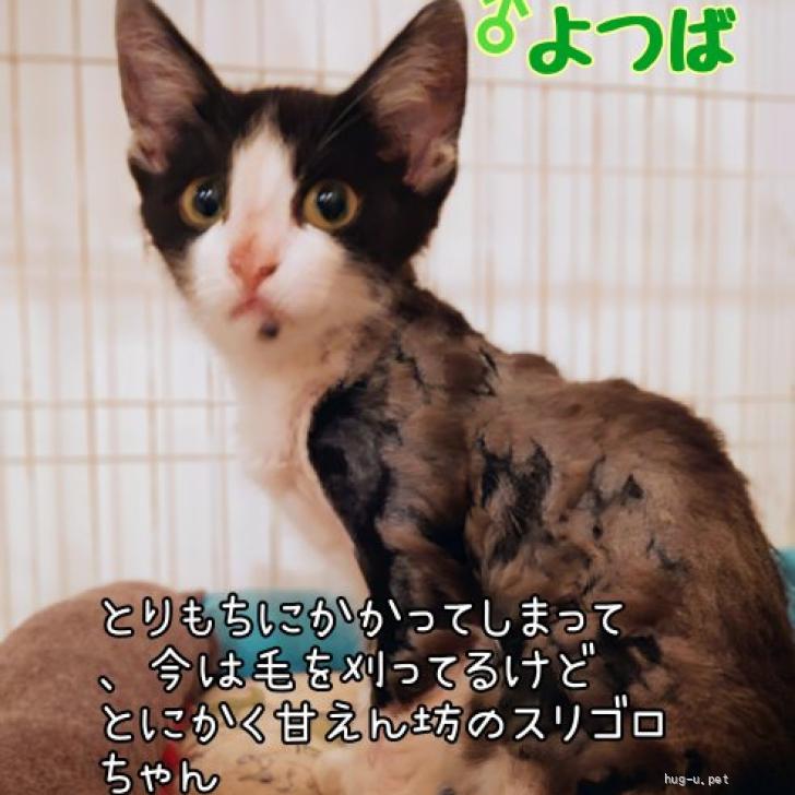 保護先でトリモチにかかってしまい、獣医さんで毛を刈ったため、今はまだらになっています