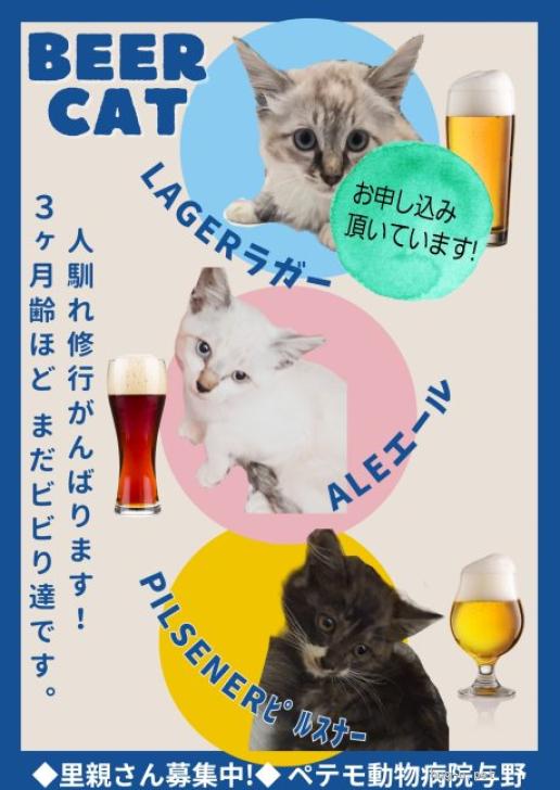 | 性格や特徴 | ビールキャット 🥂ピルスナーちゃん 3匹で茨城からやってきました。 3匹の中で一番怖がりさんで 人馴れ修行中ですが ゆっくりなでなでしてると 小さくゴロゴロ言えるように なってきました🥰 ちゅーるは大好きで あげてる間は お膝の上や なでなでも余裕です!! 体重1.3kgほど 推定4ヶ月、 女の子です🎀 1匹での譲渡可、 先住猫ちゃんがいるお家もOKです! お留守番もできます! 🐦普段の様子を Instagramから ご覧になれます @apricat_22 応募者プロフィールからリンクで飛べます✈ @ptm.yono.ah 保護している勤務病院ほごねこアカウント |