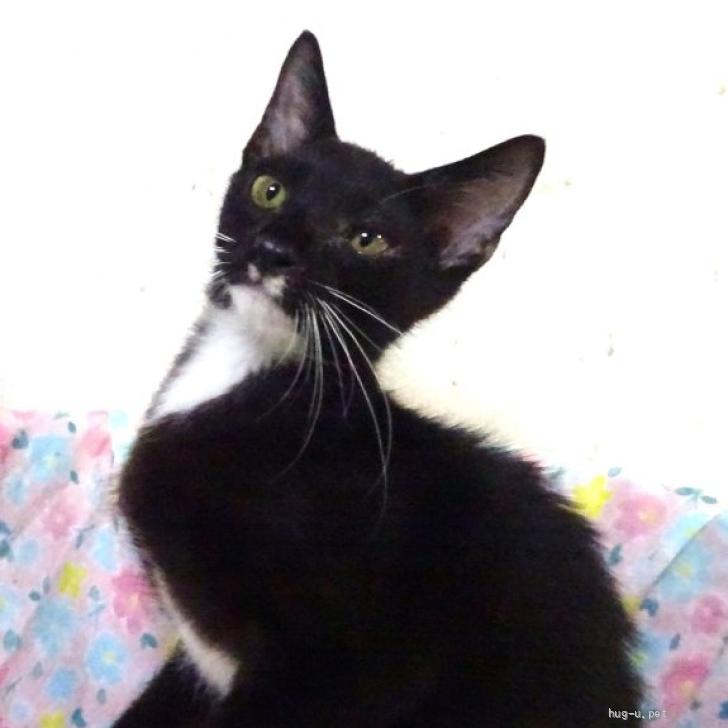 毛色: 殆ど黒ですが、手先、顔下が白の白黒です。