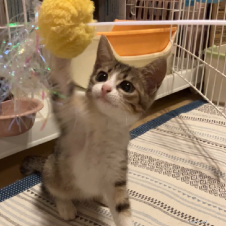 元気いっぱいのちいちゃん。クリクリのお目目とかわいい手足で猫じゃらしを追いかけます