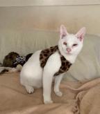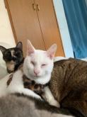 性格や特徴 可愛い白猫、JJです(名前の由来は、ジェイソンというそっくりな白猫の保護猫ちゃんがいるので、ジェイソン・ジュニアでJJとなりました)。全盲を心配致しましたが、見えているようで、日常生活は全く問題ありません。大変人懐こく、猫ちゃんにもフレンドリーです。兄弟の中では体は小さいくせにご飯の時はいの一番というイケイケな一面もあります。