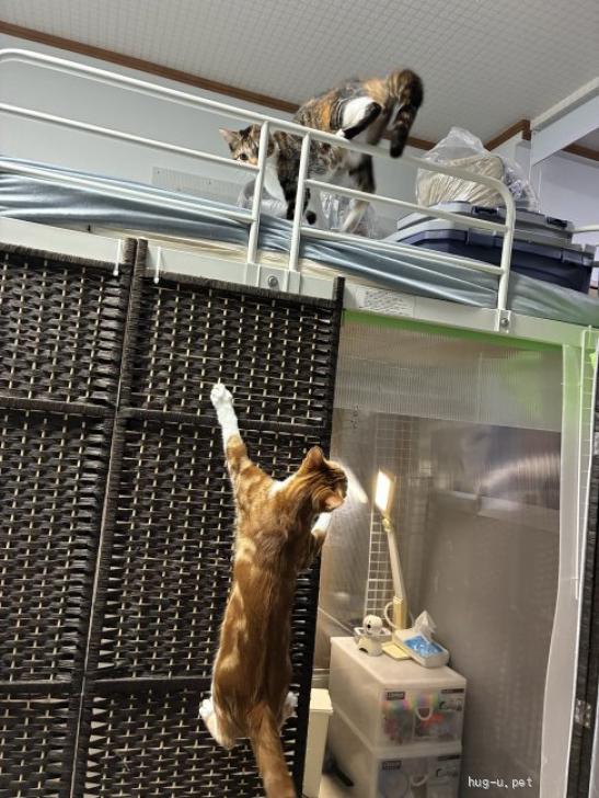 慣れない環境では、自分より一回り小さい妹猫・リボンちゃんの後ろに隠れてしまいます。