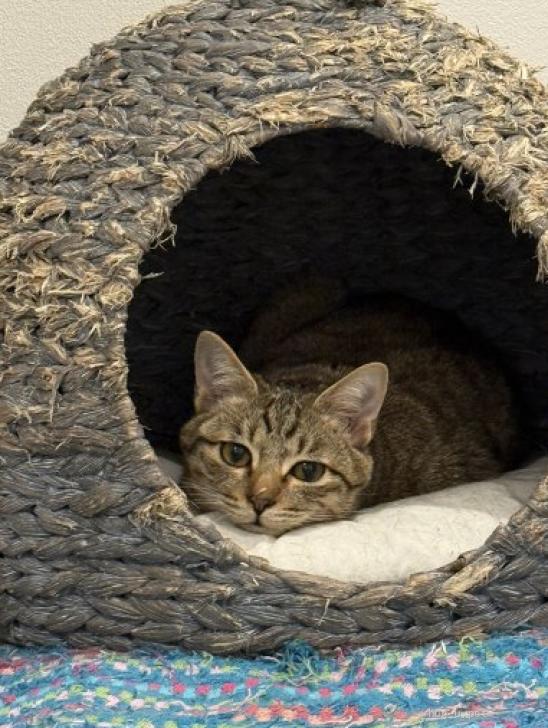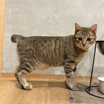 大きなお目目とカギしっぽがチャームポイントのあわちゃん。麦わらとキジトラの間のような綺麗な毛並みです。