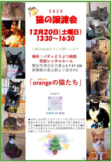 私たち『orangeの猫たち』は横浜市を中心に猫のTNRで子猫や負傷してる猫、家猫になれそうな猫は可能な限り保護をしたいと思っている個人活動者の集まりです。新しい飼い主に繋ぐことで次の保護ができます。大倉山にて譲渡会を毎月開催してます。7月〜9月は月に2回開催してます。