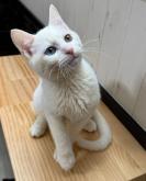 | 性格や特徴 | とても美しい金目銀目のオッドアイです。 ブルーアイの片耳が聞こえているかどうかは不明。 日常生活に支障はありません。 しっぽは長めです。 超マイペースであんまり動じない子猫らしくない落ち着きのある猫です 一度黒猫と一緒に譲渡しましたが、2週間で飼い主さん都合で戻ってきてしまいました。 |