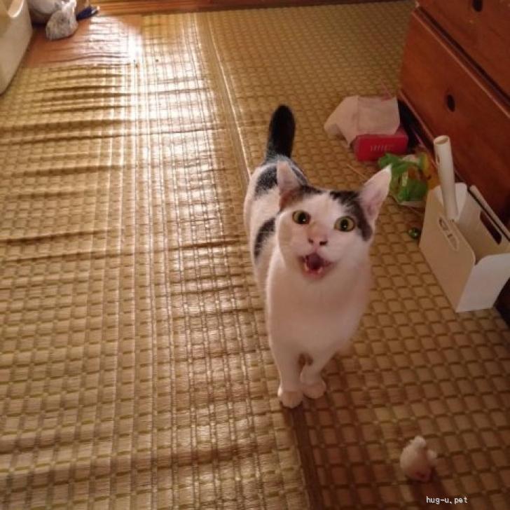 性格や特徴 多頭現場で生まれ育った猫です。たくさんの猫とうまくやってきました。攻撃性も威嚇もなく平和主義です。少しビビリで人見知りがありますが、ご飯のときはにゃ~にゃ~かわいい声で鳴きながら足にまとわりついて短い尻尾でパタパタ私の足をはたいて催促します。食いしん坊です。ご飯をもらうまであきらめずにまっすぐこっちを凝視します。