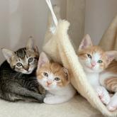 | 性格や特徴 | きいな(キジ)メス なあな(茶白)オス たあた(茶白短尾)オス 人がミルクで育てた物怖じしない甘えん坊で仲良しな三兄妹です 現在は岩国の個人ボランティアさんがご家族の協力の元でお世話しています。 未だ生後2ヶ月の子猫ですので体調の急変が怖いので、お留守番が短く、ご飯や排泄、体重などしっかり管理してくださる時間的にも精神的にも余裕があるご家庭にお願いしたいと考えています。 |