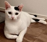 性格や特徴 しっぽと数箇所のブチが黒いほぼ白の若い女の子。