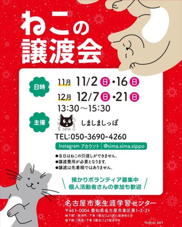 名古屋市東区にて定期的に譲渡会を開催していますので、お問合せまたは会場にお越しください