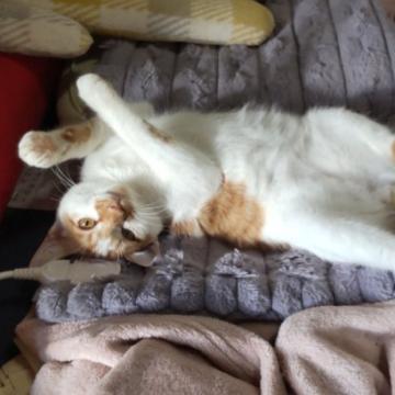 性格や特徴 とても元気で毎日先住猫たちを追いかけて走り回っています。米俵のようなむちむちボディにおまんじゅうのようなもっちりしたお顔が乗っています。尻尾がとても短く、うさぎのような尻尾のせいか、上から見るとなんだか米俵のように見え、最近のあだ名は走る米俵です。