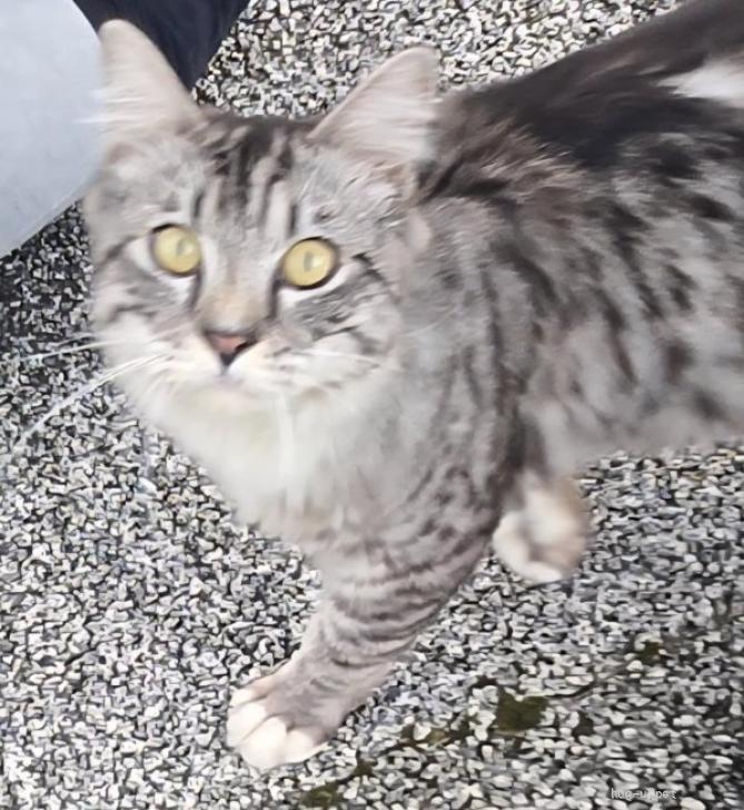 毛色はシルバーとホワイト、トラの柄で長毛の長いしっぽです。