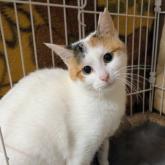 きれいな白色にお顔とおしりとシッポに三毛が入った毛色で、優しいお顔のとても可愛い女の子です。