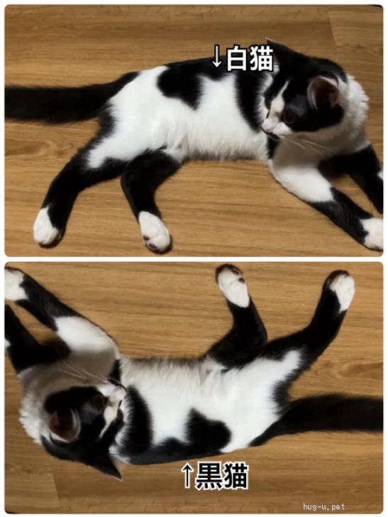 チョビ髭で模様にトリックアートな白猫と黒子猫がいる長毛気味な子。